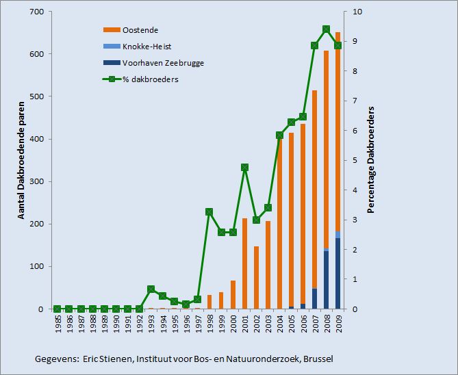 Sinds 1993 broedt de zilvermeeuw boven op de daken in de Oostendse regio, sinds 1999 ook de kleine mantelmeeuw. In hun zoektocht naar nieuwe broedgebieden vonden de vogels de gebouwen in het centrum van Oostende en in de stadsrand (boven op loodsen of op de Vismijn) een aantrekkelijk alternatief. Sinds 2005 komen ook broedgevallen voor boven op daken in de Zeebrugse voorhaven. In 2007 worden de eerste broedgevallen gesignaleerd in Knokke-Heist en vanaf 2012 broeden ze ook in Blankenberge.